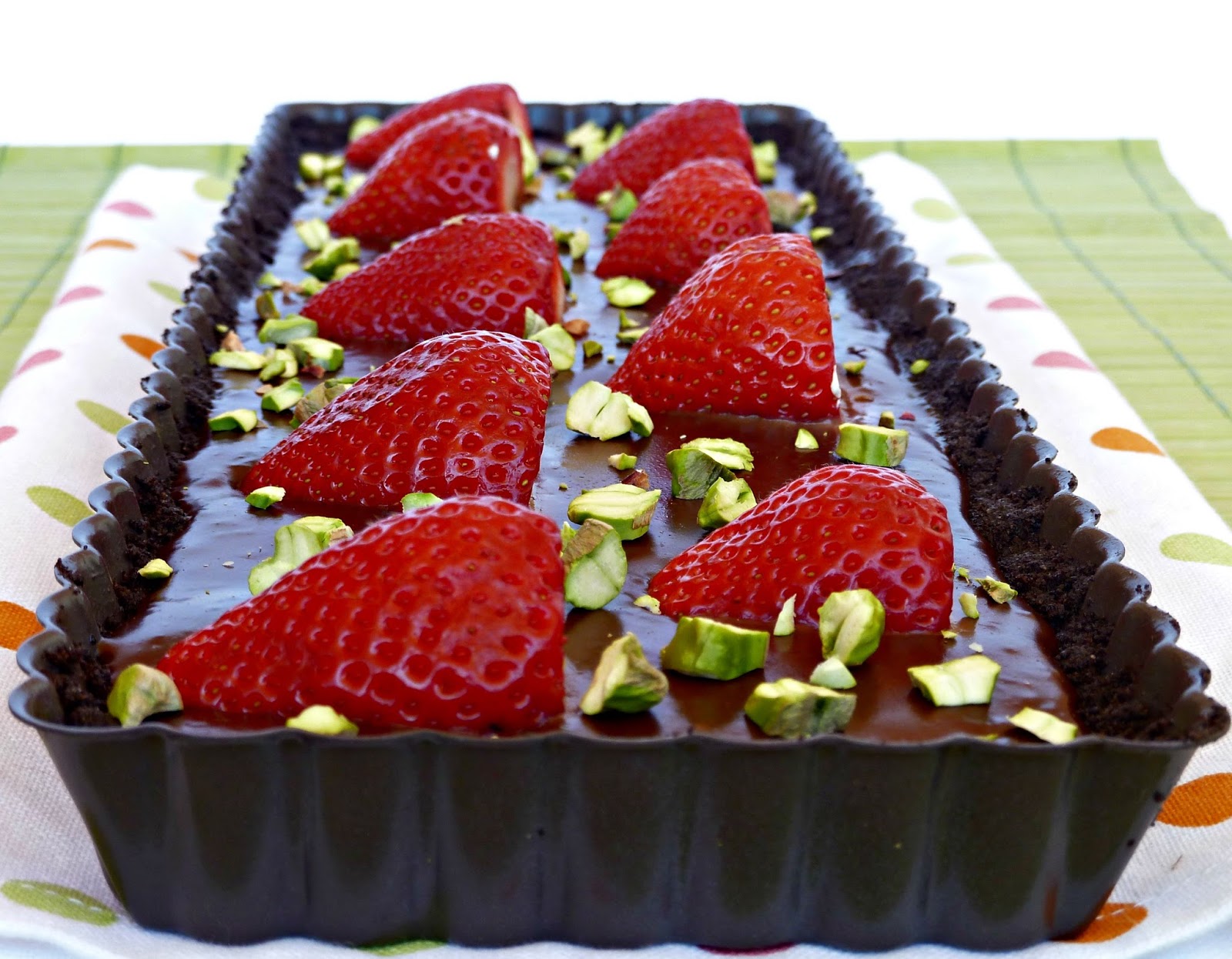 - Cuando el chocolate está un poquito menos caliente, volcamos sobre la base, limpiamos y lavamos bien las fresas y las colocamos encima de forma asimétrica. Espolvoreamos con el fruto seco que queramos y a la nevera unas 4 horas como mínimo para que coja cuerpo.